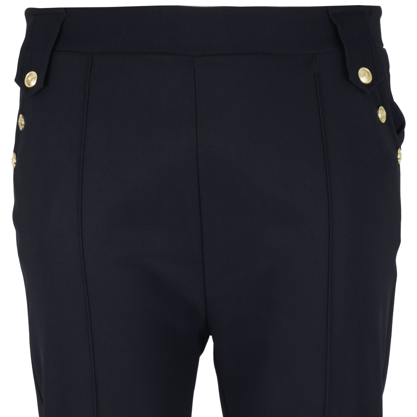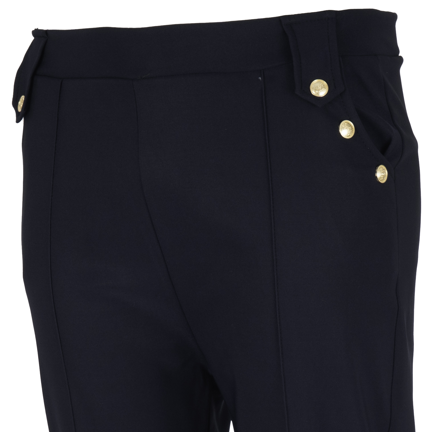 Spodnie damskie z ozdobnymi guzikami i przeszyciem na nogawce.